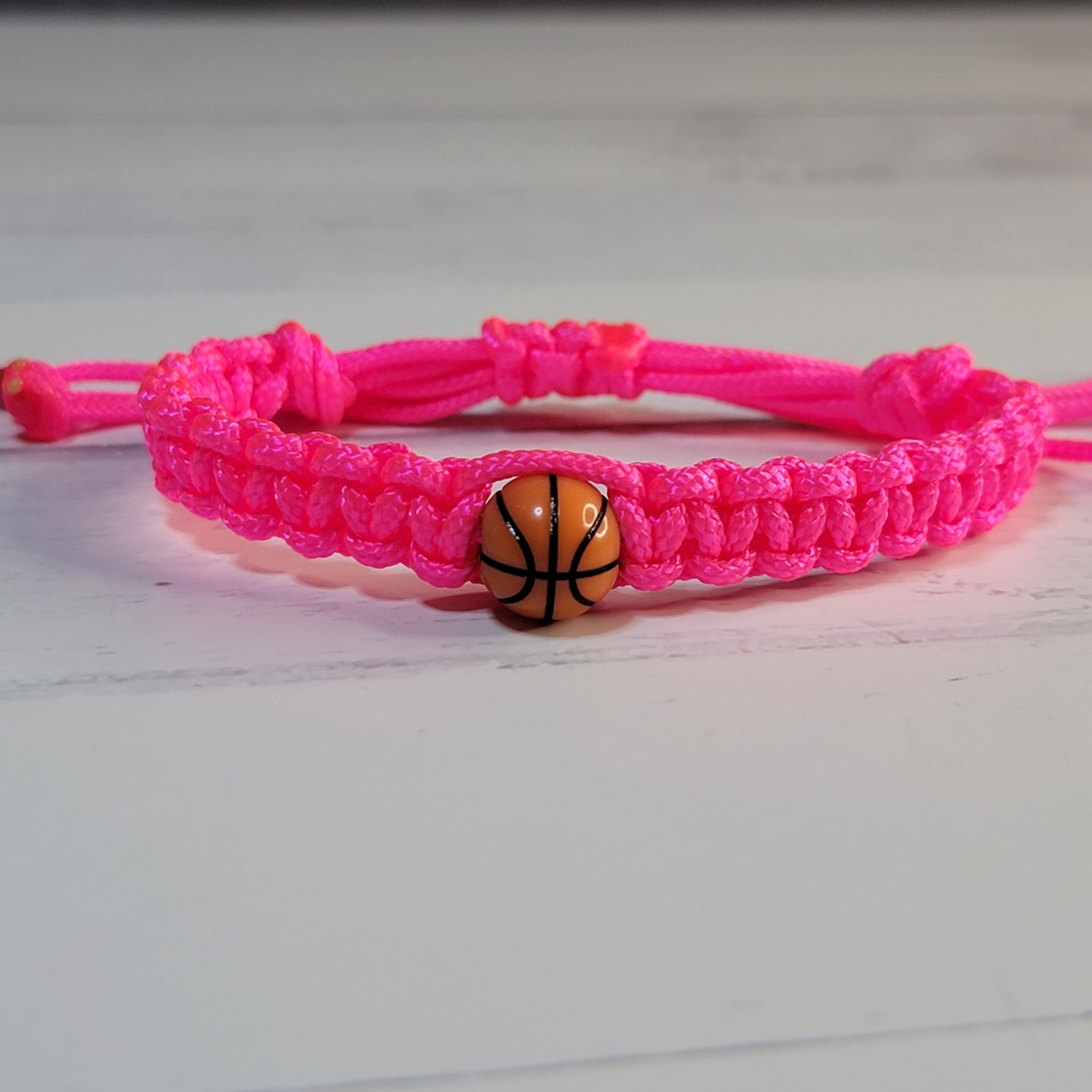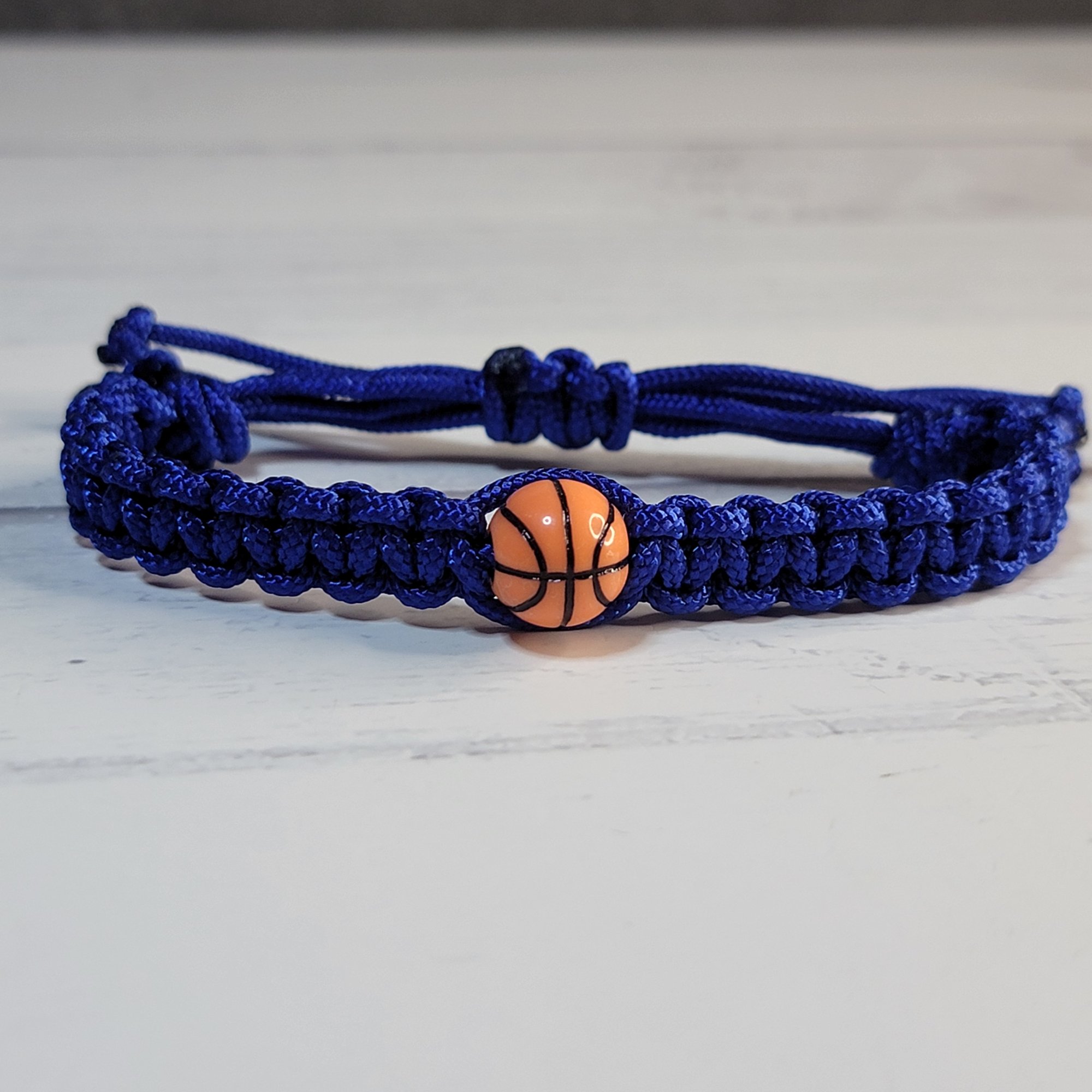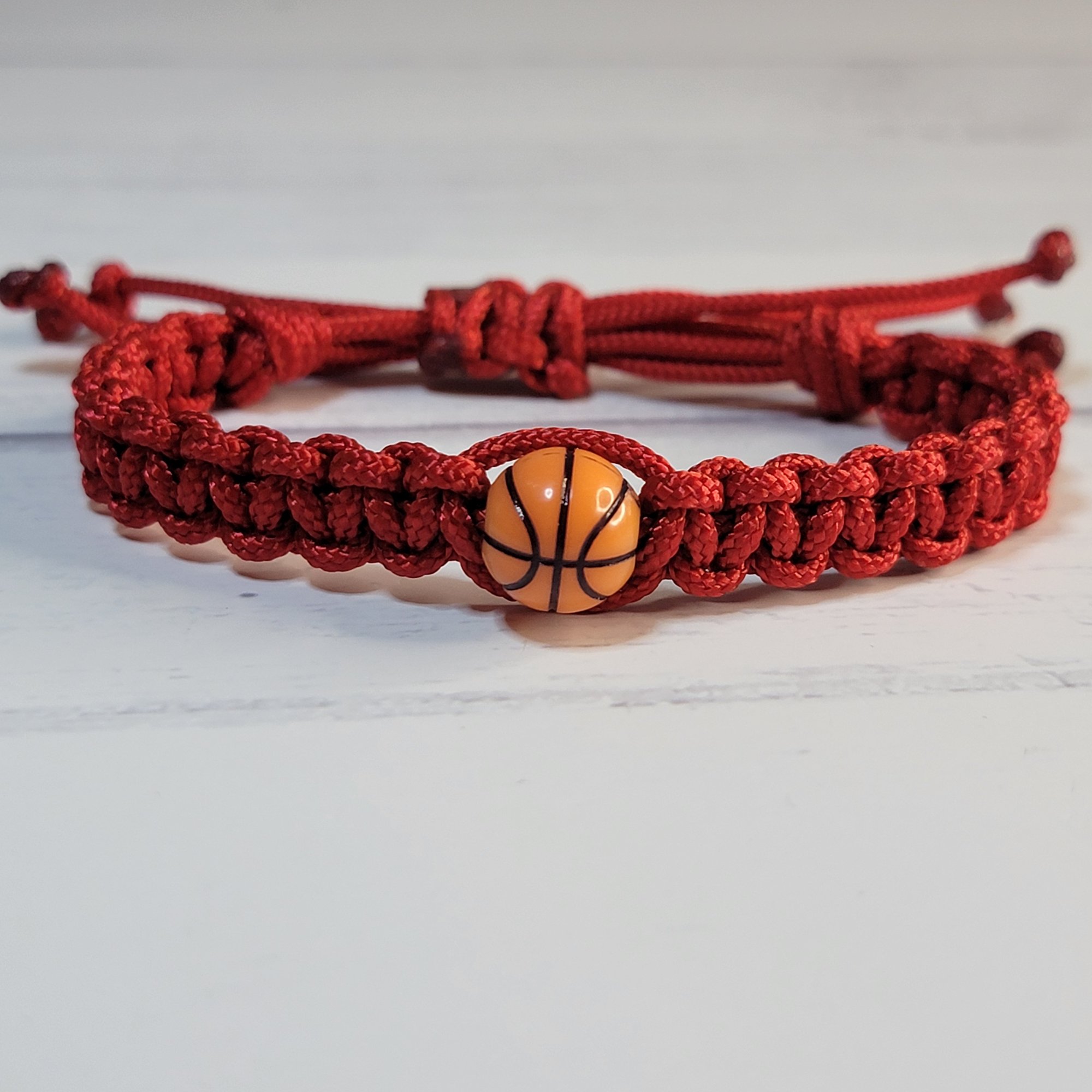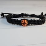 - An adjustable thin paracord bracelet featuring a basketball decoration. Perfect for basketball fans and great for party favors!