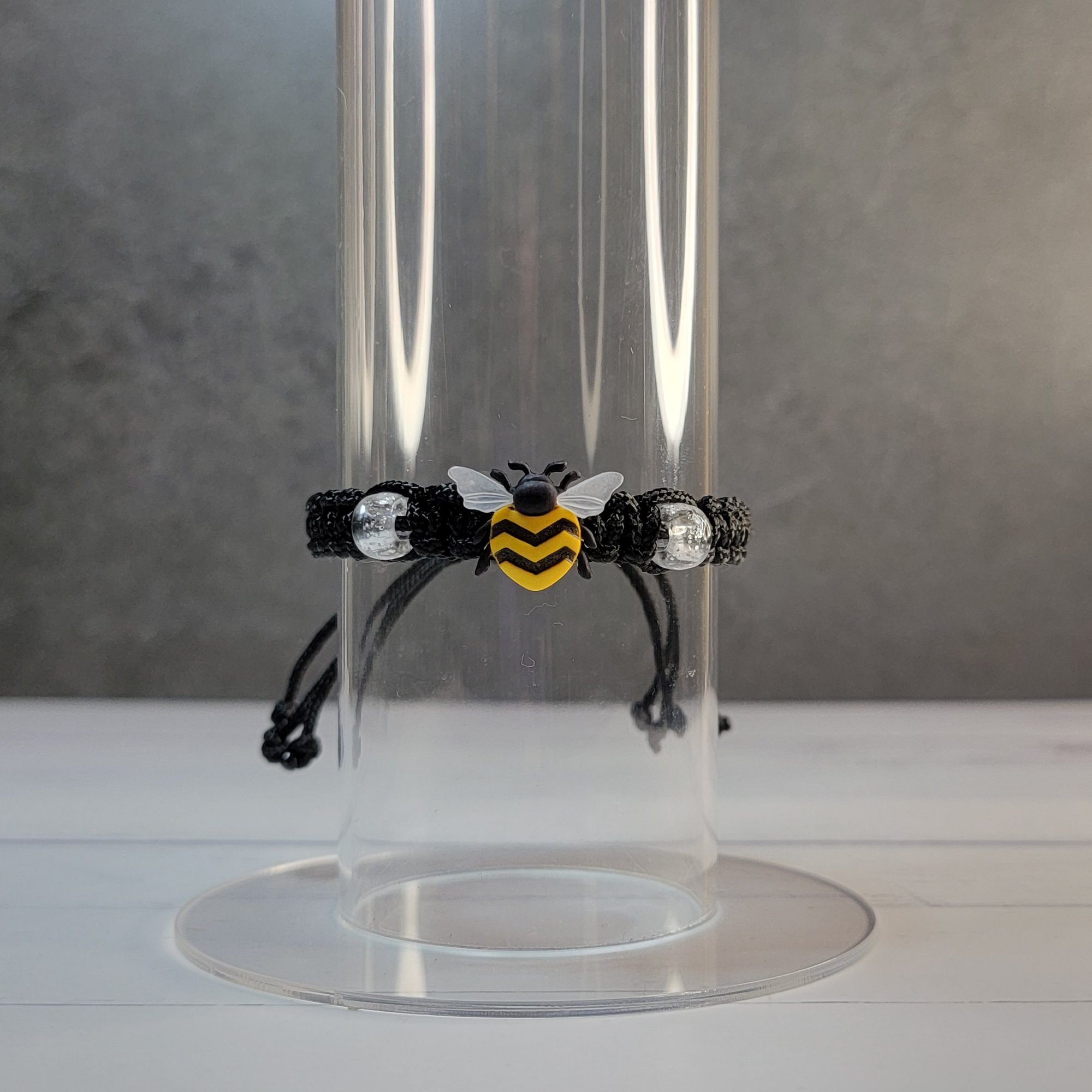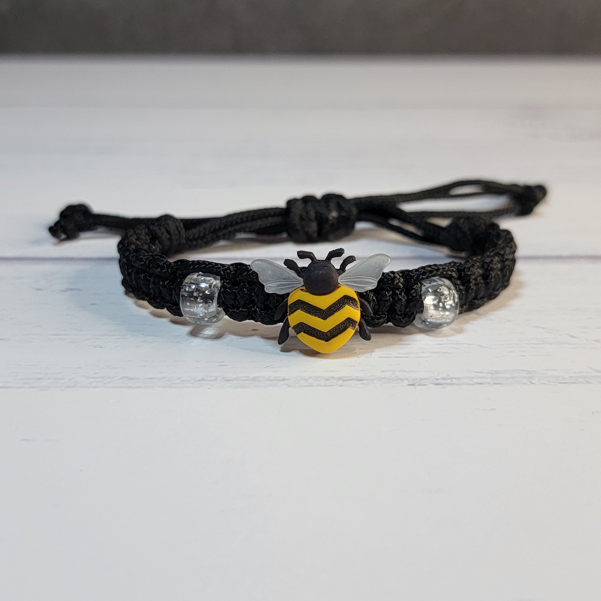 - An adjustable thin paracord bracelet featuring a bee decoration. Perfect for bee fans and great for party favors!