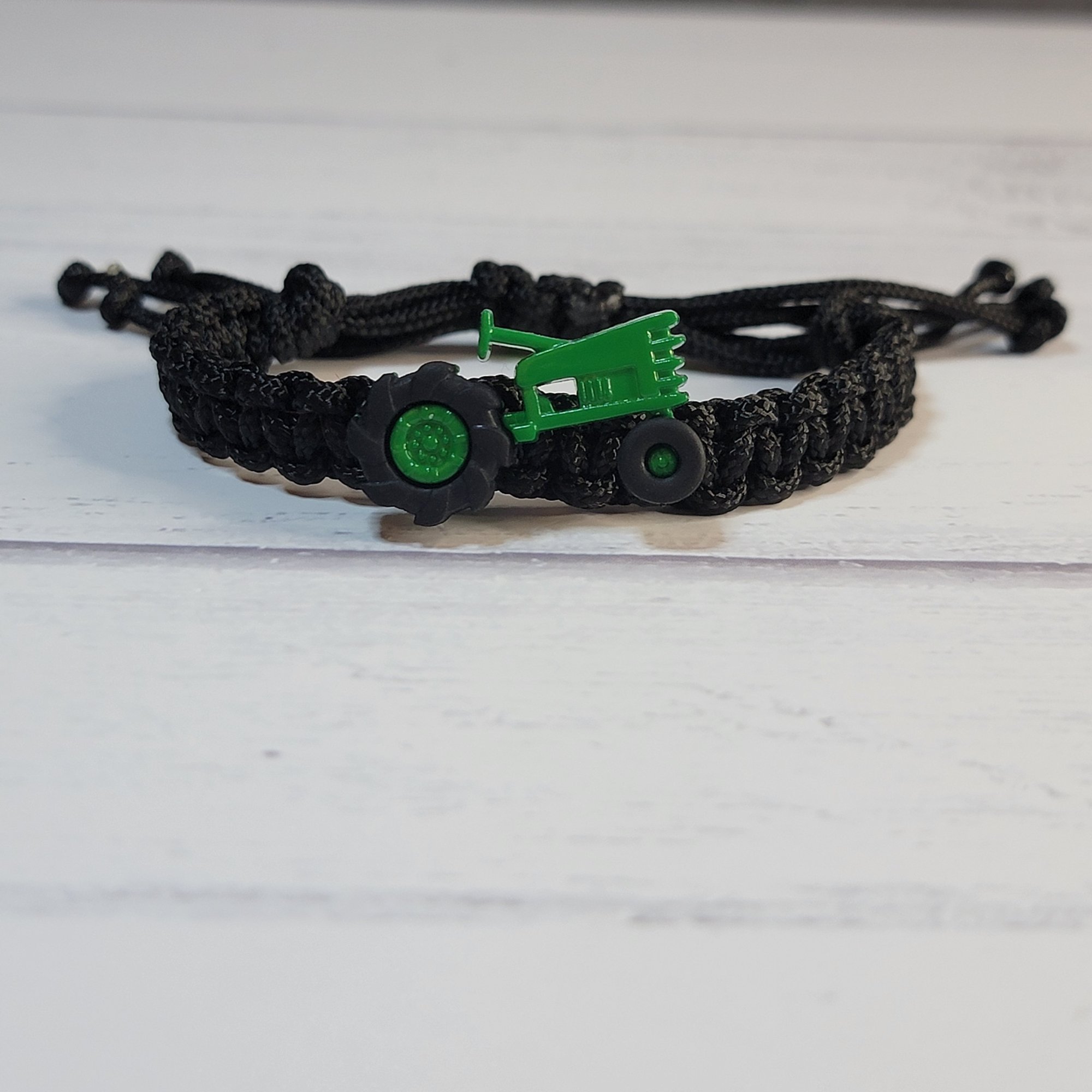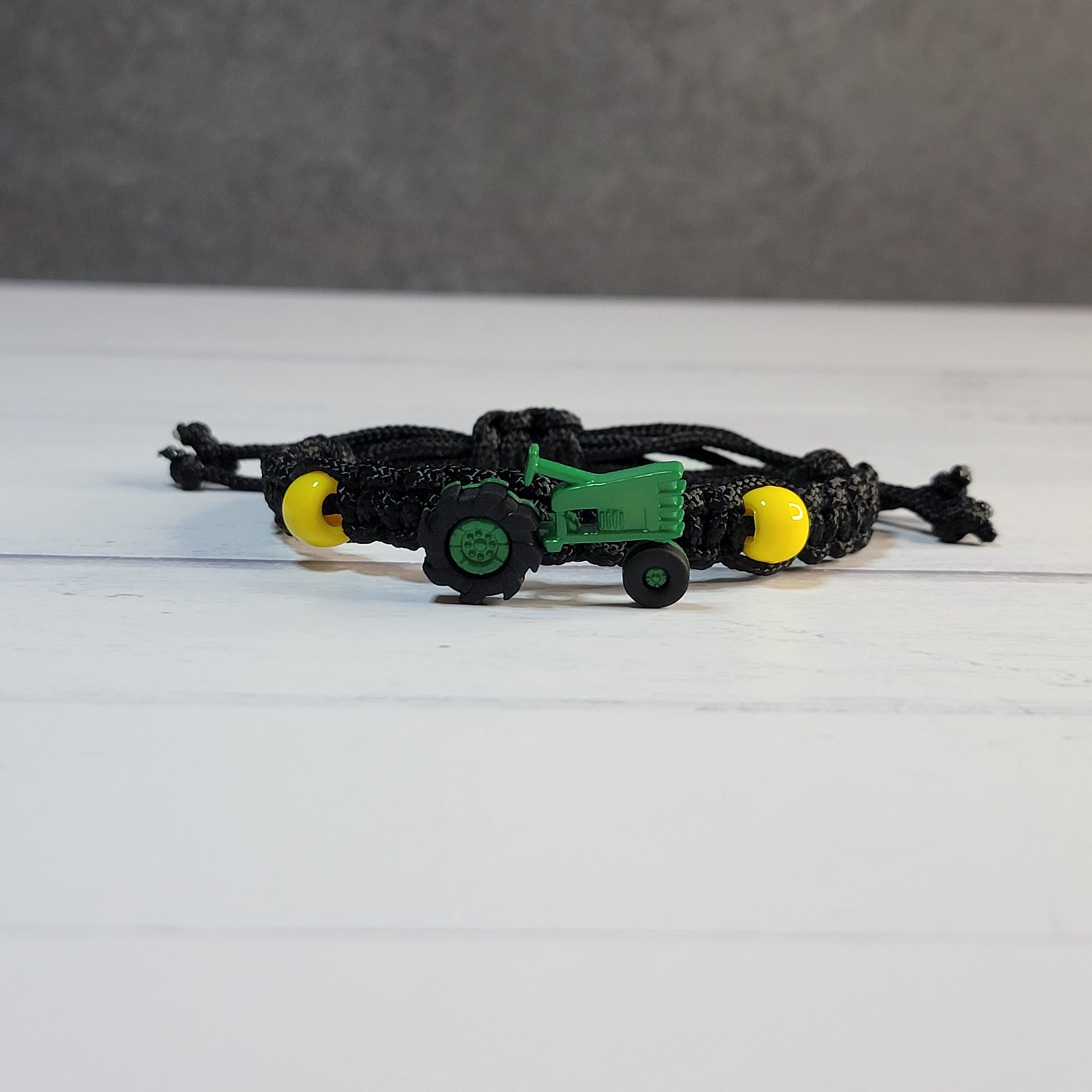 - An adjustable thin paracord bracelet featuring a tractor decoration and your choice of having yellow pony beads or no beads. Perfect for tractor fans and great for party favors!