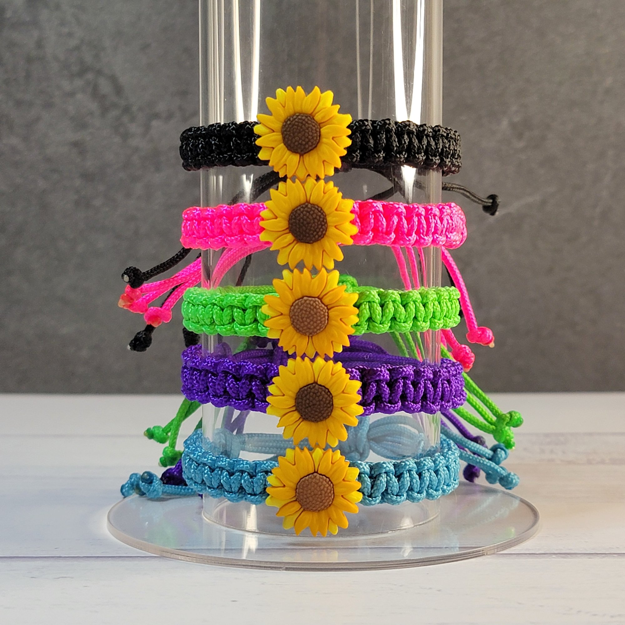 - An adjustable thin paracord bracelet featuring a sunflower decoration. Perfect for sunflower fans and great for party favors!